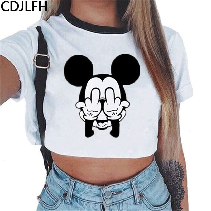 2019 Summer Crop Top T Shirts Women Harajuku Kawaii Mouse Shy Expression Printed Tees Shirt Femme Tops Streetwear Women's Shirts
