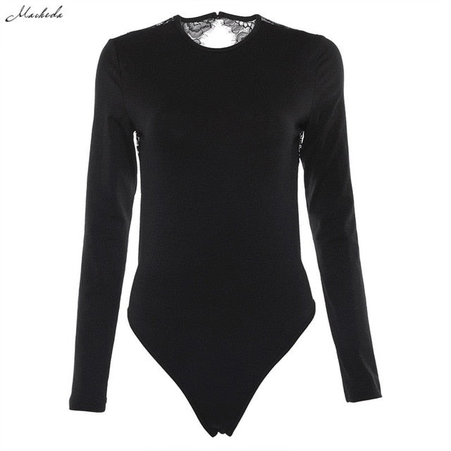 Macheda Sexy Backless Lace Patchwork Bodysuit Black O Neck Long Sleeve Slim Women Bodysuits Skinny Party Bodysuit 2018 New