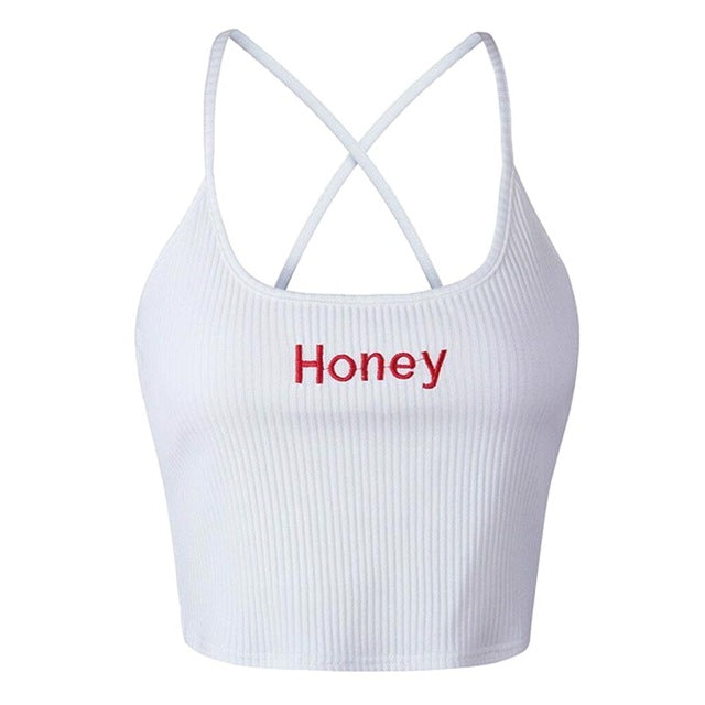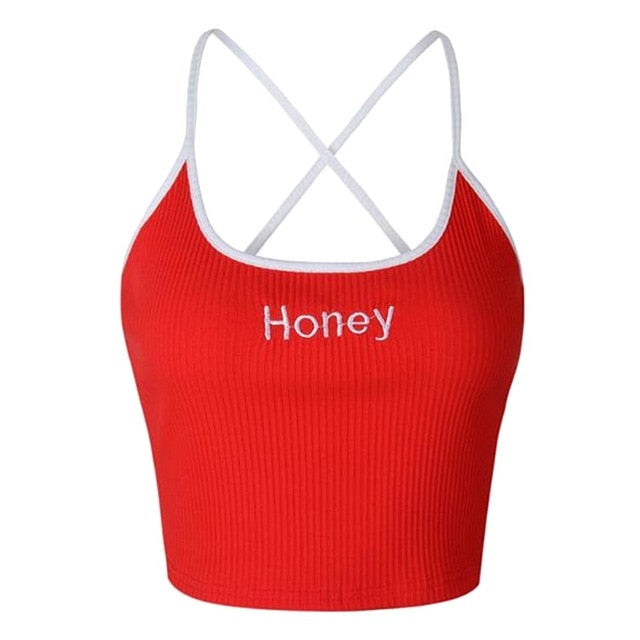 White Red Ladies Short Tight Shirt Women Fashion Honey Letter Strap Tank Tops 2018 Female Slip Crop Tops Sexy Club Camisoles