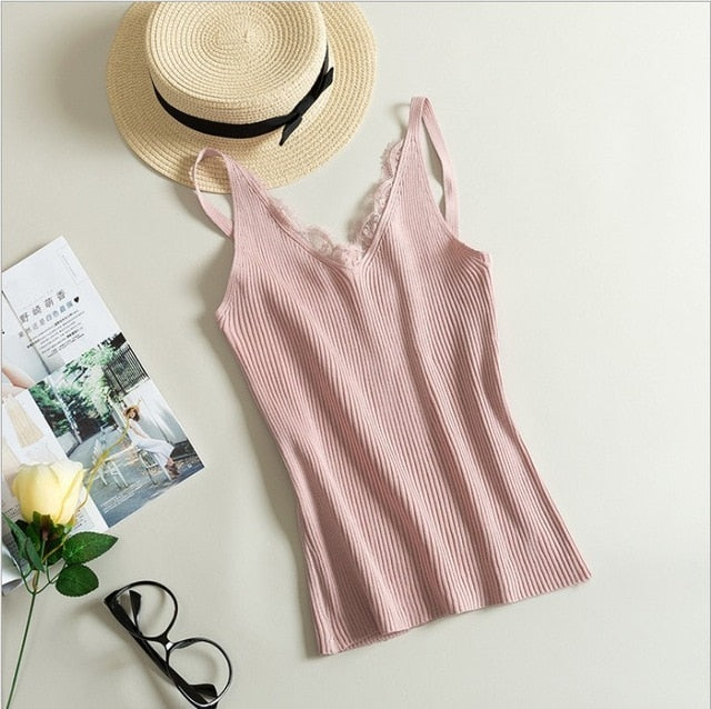 Women Hook Flower Lace Tank solid Stitching V-neck Camis Female Knitted Short Slim Sleeveless Shirt Tank Casual Tops