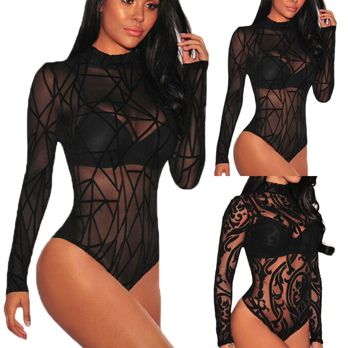Women Sexy Sheer Mesh Lace Jumpsuit Long Sleeve Top Turtleneck Bodysuit USA
