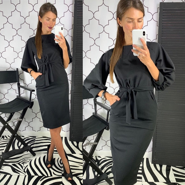 Women Vintage Lantern Sleeve Sashes Party D ress Long Sleeve O neck Solid Sheath Elegant Casual Dress 2019 Autumn Fashion Dress
